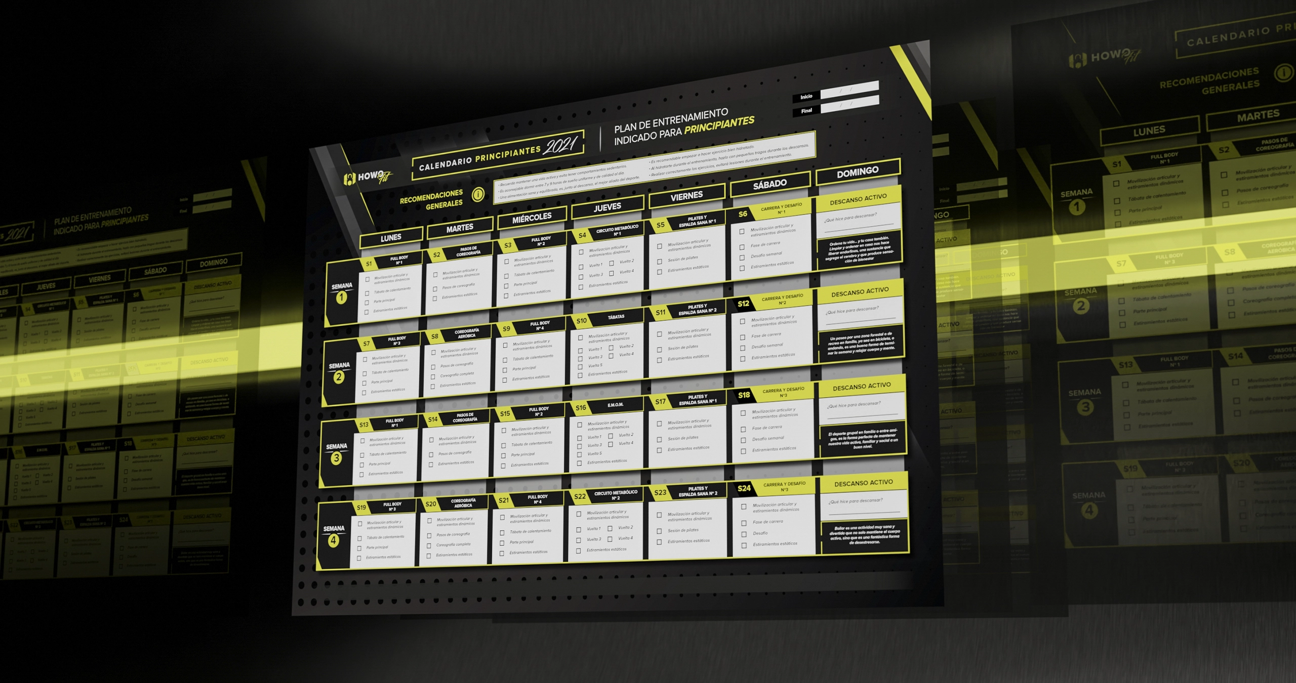 Como canal de contenido e iniciativa, Howo Fit pretende llevar a sus suscriptores un entrenamiento en casa asistido con vídeos explicativos sobre rutinas de entrenamiento, movimientos, tablas de calentamiento… y otros apoyos gráficos y textuales como calendarios interactivos. Para ello, ha sido imprescindible plantear y desarrollar una identidad corporativa reconocible y potente visualmente.